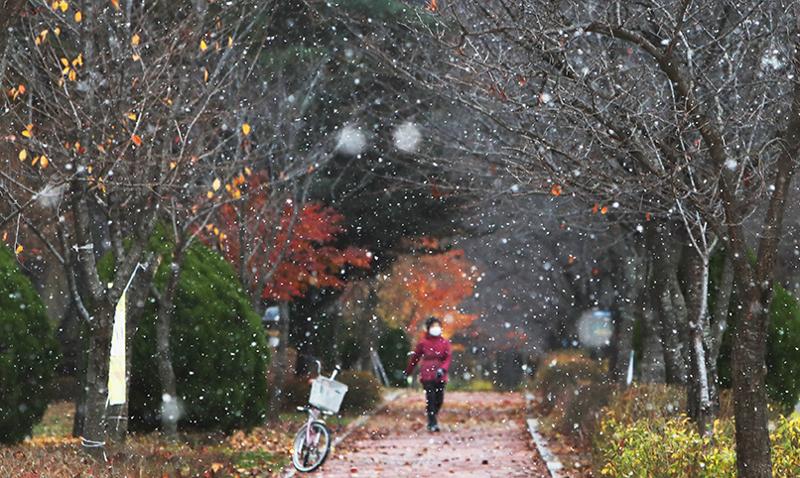 Tuyết rơi tại Công viên Ilwol ở quận Gwonseon-gu của thành phố Suwon, tỉnh Gyeonggi-do